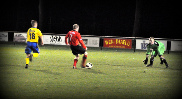 De eerste kwartier van deze wedstrijd onder kunstlicht liet echter weer het ergst vrezen voor Baarlo. Het was Maarheeze namelijk dat in de beginfase het heft in handen had. De gasten kwamen daarbij ook enkele malen met best wat dreiging in het Baarlose strafschopgebied, waarbij doelman Jeffrey Schouenberg echter als het erop aan kwam het onheil wist te bezweren. Pas rond de 20e minuut was Baarlo voor het eerst gevaarlijk. Matthijs Hanssen bereikte de vrij door het centrum penetrerende Rik Schotman, die de bal echter niet goed aannam waardoor een goede kans verloren ging. Maar nog geen twee minuten later wist Baarlo toch de openingstreffer aan te tekenen. Uit een hoge voorzet van Maikel van Erp vanaf de linkerflank kopte Matthijs Hanssen in een druk strafschopgebied de bal knap in de linkerbenedenhoek van het doel: 1-0.