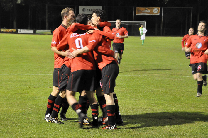 Vreugde bij Baarlo na de openingstreffer met doelpuntenmaker Matthijs Hanssen (nr.9) als middelpunt (Foto:LenG).
